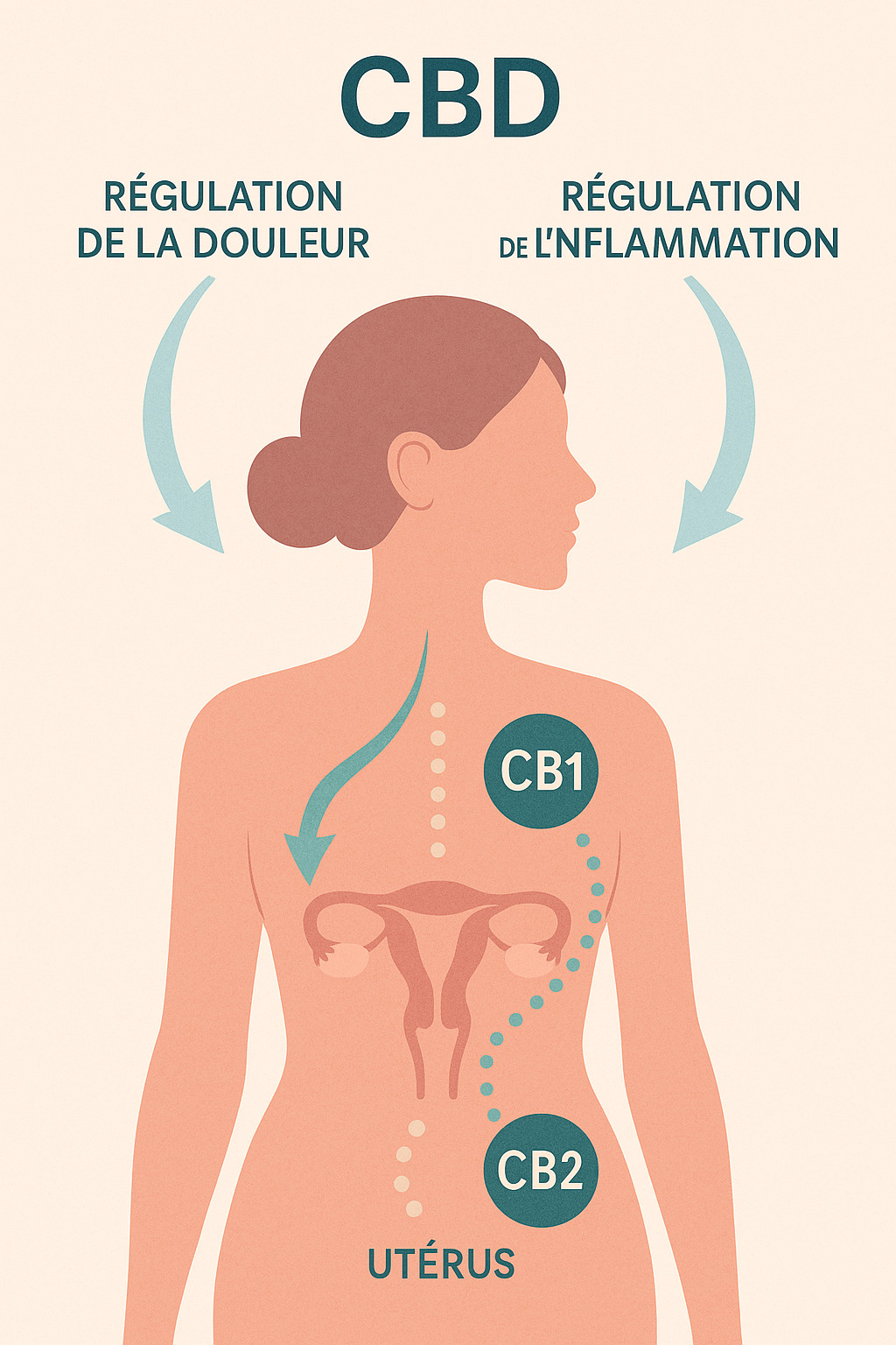 En parallèle, le système endocannabinoïde (récepteurs CB1, CB2 et endocannabinoïdes) est exprimé dans l’utérus et plus largement dans l’appareil reproducteur féminin. Il joue un rôle dans la douleur, l’inflammation, le tonus musculaire et l’humeur. (<https://www.nature.com/articles/s44...> )